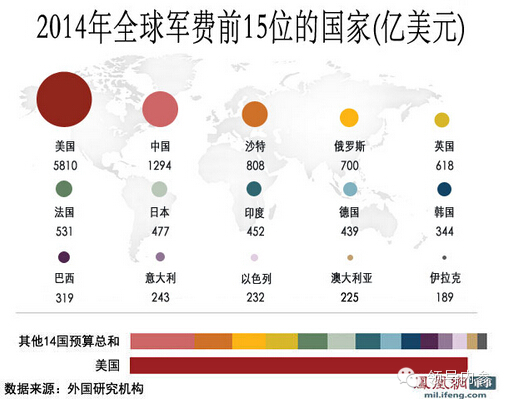 2014年主要国家军费,美军军费几乎相当于其他14国军费总和